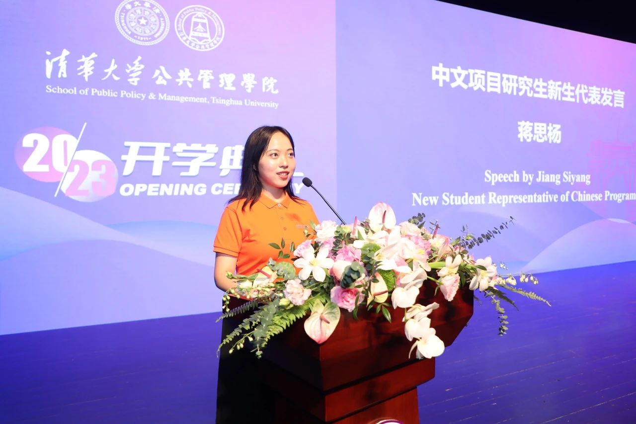 2023级中文项目新生代表蒋思杨发言。蒋思杨同学曾获得清华大学学生社会实践金奖个人,将继续在公管学院攻读博士学位。她认为与清华公管相遇是一种运气,但是还要寻找另外三种气。一是在时代洪流中站稳脚跟,培养扎根现实的底气。二是在被拒绝和被否定时坚定信心,锤炼保持希望的勇气。三是从高手如云的环境里汲取养分,始终怀有谦逊敬畏的服气。