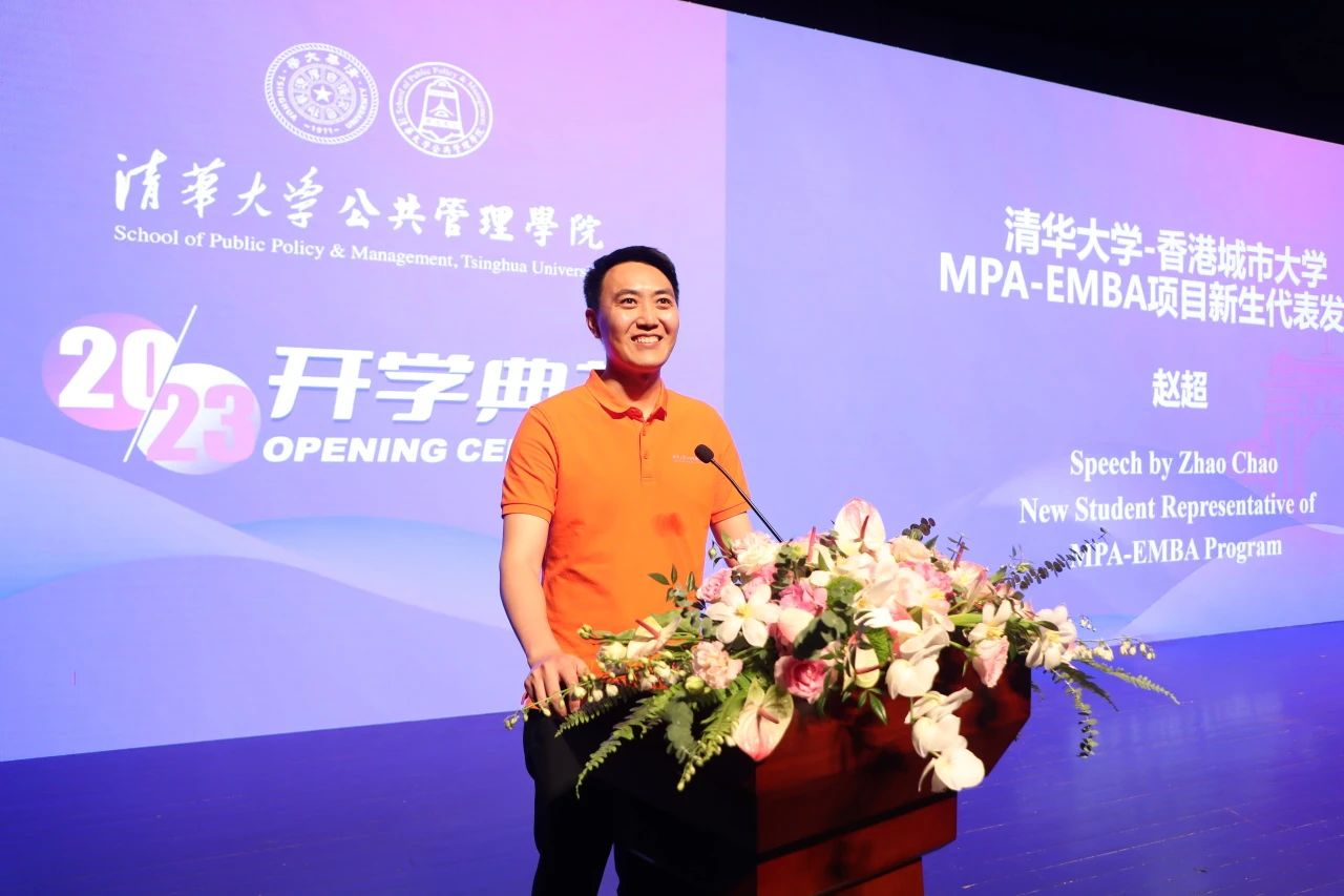 2023级清华大学-香港城市大学MPA-EMBA项目新生代表赵超发言。赵超同学是一名金融行业从业者,他认为对于2023年新入学的同学们有两点很幸运。一是不同于疫情线上的教学活动,现在可以坐在教室里,行走在美丽的校园里。二是今年也是“一带一路”倡议提出十周年,在下一个十年,希望大家能够贡献自己学习到的知识,砥砺奋进,助推沿线国家和地区繁荣进步。