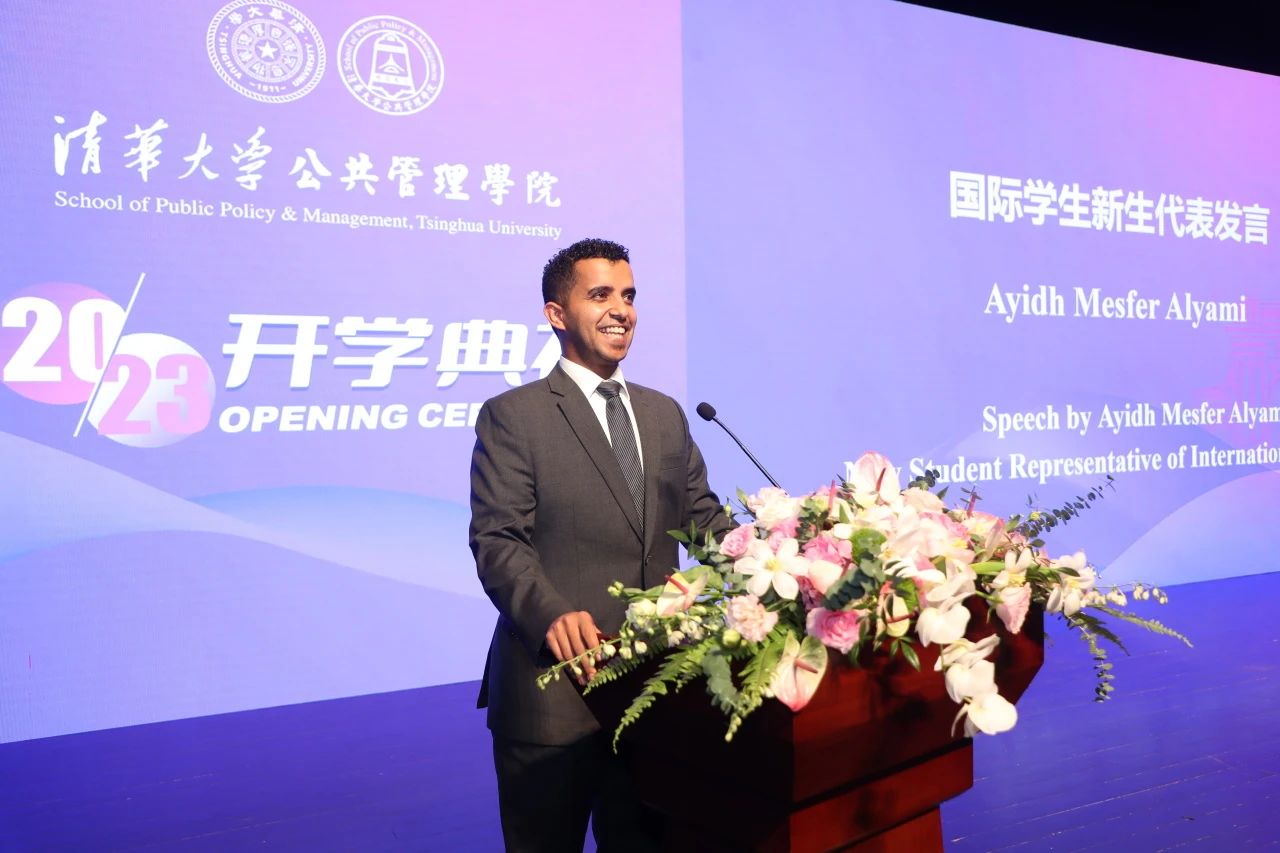 2023级留学生新生代表艾伊德·阿里亚米发言。艾伊德·阿里亚米同学现任沙特投资部驻华代表,他表示,清华公管是学术成就的光辉典范,是创新的中心,也是未来全球领导者的培养者。留学生的存在体现了清华公管对于跨文化参与和合作的注重。他希望在这里扩展视野,构建连接两个国家的桥梁,推动不同观点和背景融合。