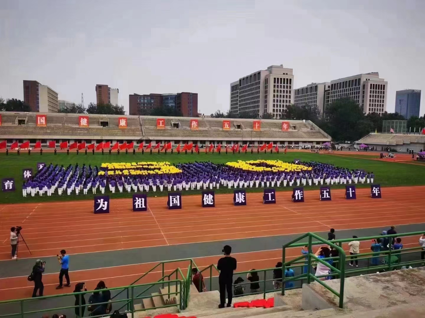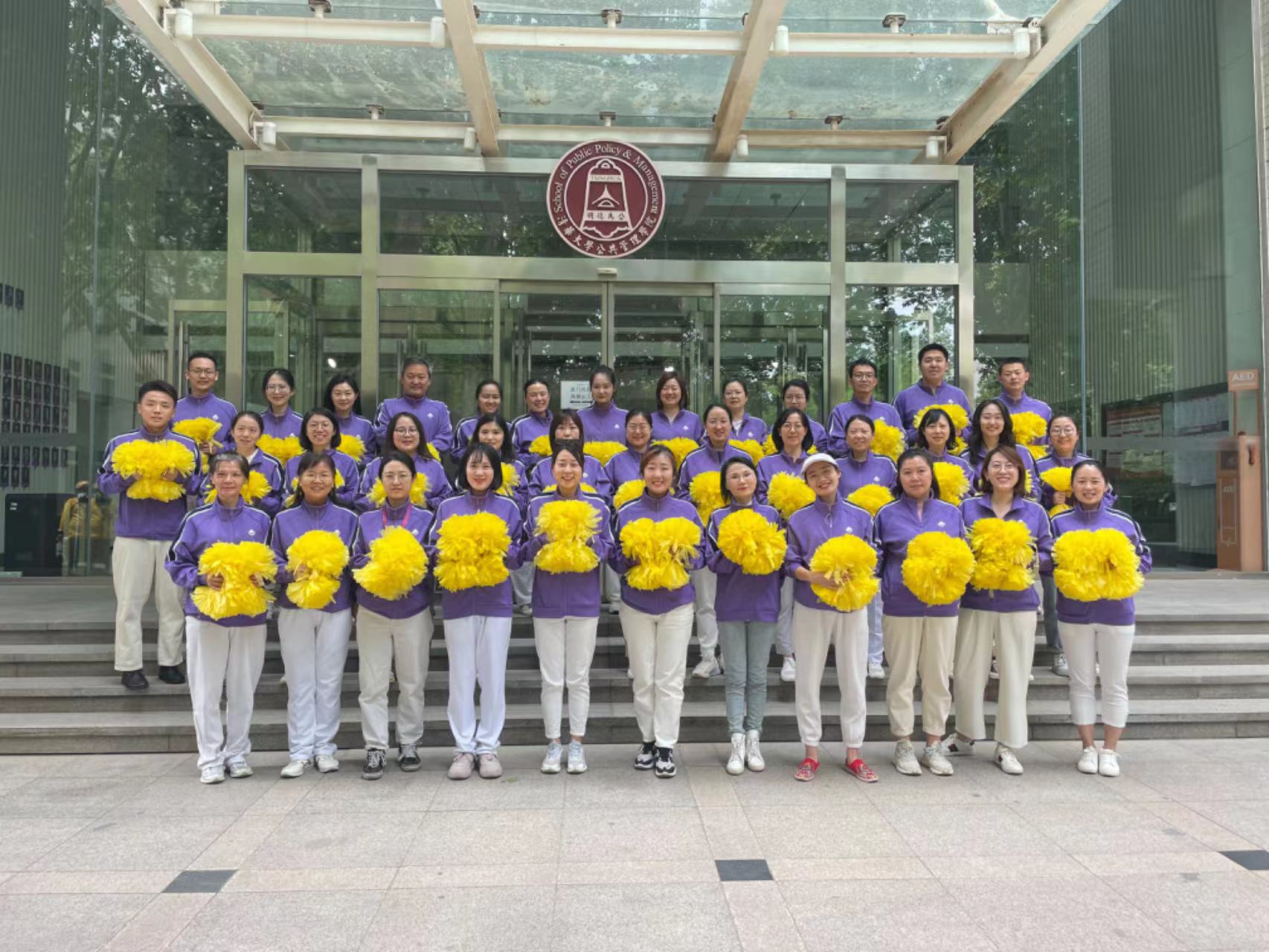 “无体育、不清华”,全校教职工正在以“争取为祖国健康工作五十年”的清华体育精神为推动中国特色世界一流大学高质量发展做出贡献。在运动会的入场式上,我院20名教职工在学院党委书记彭宗超的带领下迈着整齐的步伐,以积极向上的精神状态向主席台的校领导和兄弟单位展示出了公管人朝气蓬勃的飒爽英姿。在入场式之后的广播操表演中,各位教工随着优美的节拍,整齐划一的做好每一个动作。花穗健身操队伍在《我和我的祖国》歌声中欢快起舞,全体队员用花穗组成了“50”的图案,表达了广大教职工对第50届教工运动会的祝福。