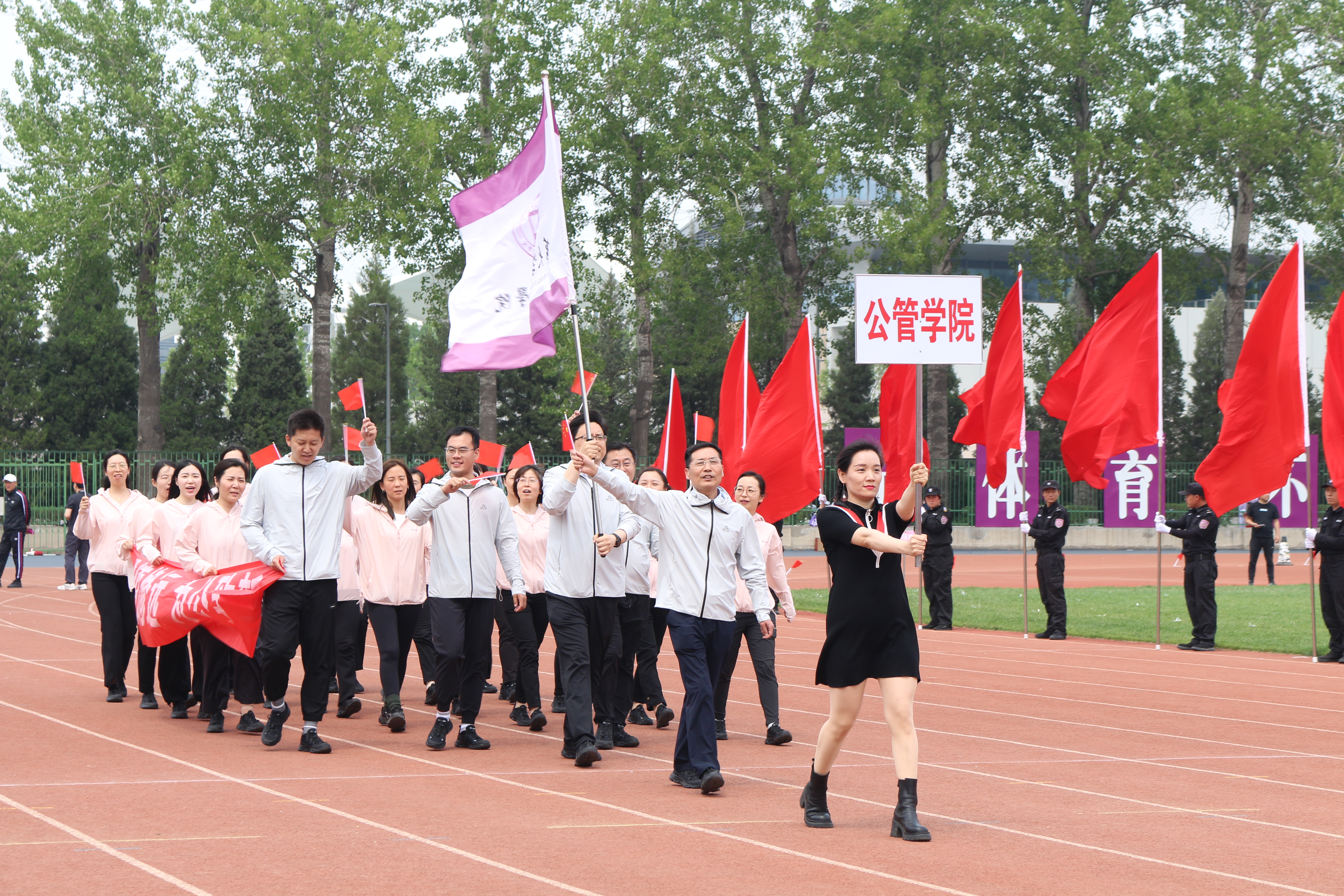 立夏时节的清华园,草长莺飞,水清木华。学校第50届教工运动会于5月11日下午在东大操场开幕,来自全校的5000余名教职员工报名参加了此次运动会。公管学院70多名教职员工在学院党委书记彭宗超、党委副书记、工会主席周绍杰的带领下参加了运动会入场式、广播操、花穗操以及竞赛项目。