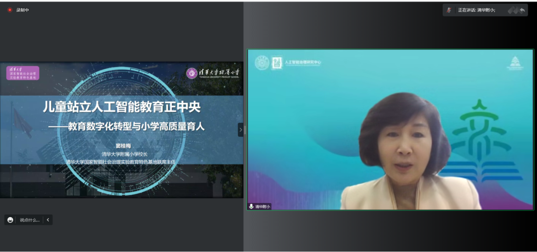 清华大学附属小学校长、全国特级教师窦桂梅的主旨演讲以“教育数字化转型与小学高质量育人”为题,她认为,技术在教育中的价值不是由技术决定的,而是由人决定的。主要从课程供给让儿童与人工智能对话、新基建赋能师生一日学校生活、线上线下融合教学,淬炼师生信息素养等方面进行了阐述。窦校长也分享了清华附小在科学教育方面的实践探索,包括课堂知识迁移应用,可辐射赛事平台锻造,智慧校园新基础建设,个性化精准化的育教学评价。她指出,学生未来的“试卷”,是一项项真实的未知挑战,儿童应对生活的本领,从会与智能设备“对话”开始。智能化教育生态打造了以儿童为中心的、高质量的、个性化的教育体系,为教育数字化转型创造了条件,促进数字化与教育的深度融合。如何构建虚实融合、数据驱动、人机协同的智慧教育环境,如何建立师生信息素养提升的无边界学校,如何探索信息时代小学教育治理新模式,如何解决好当前教育数字化转型面临的现实困境,是亟待我们研究解决的问题。