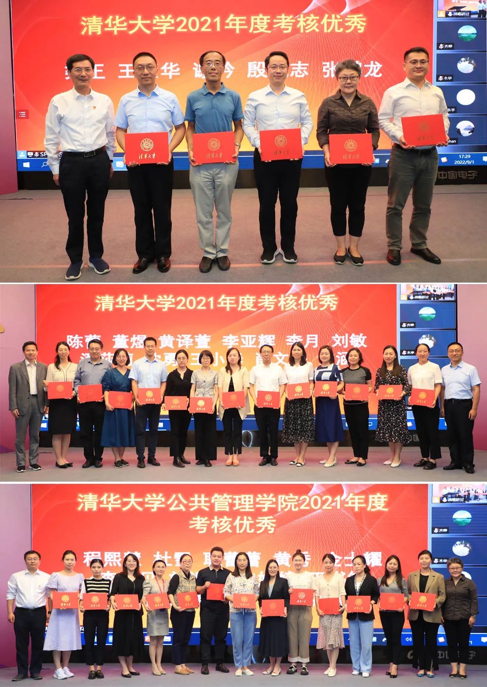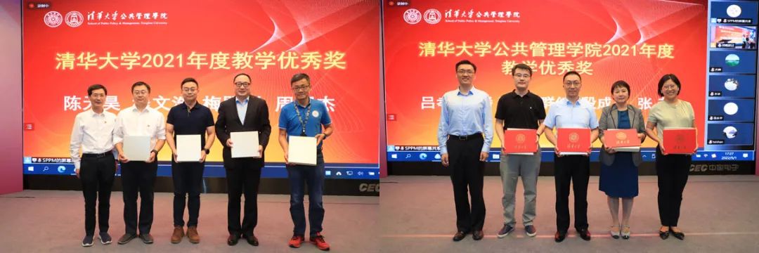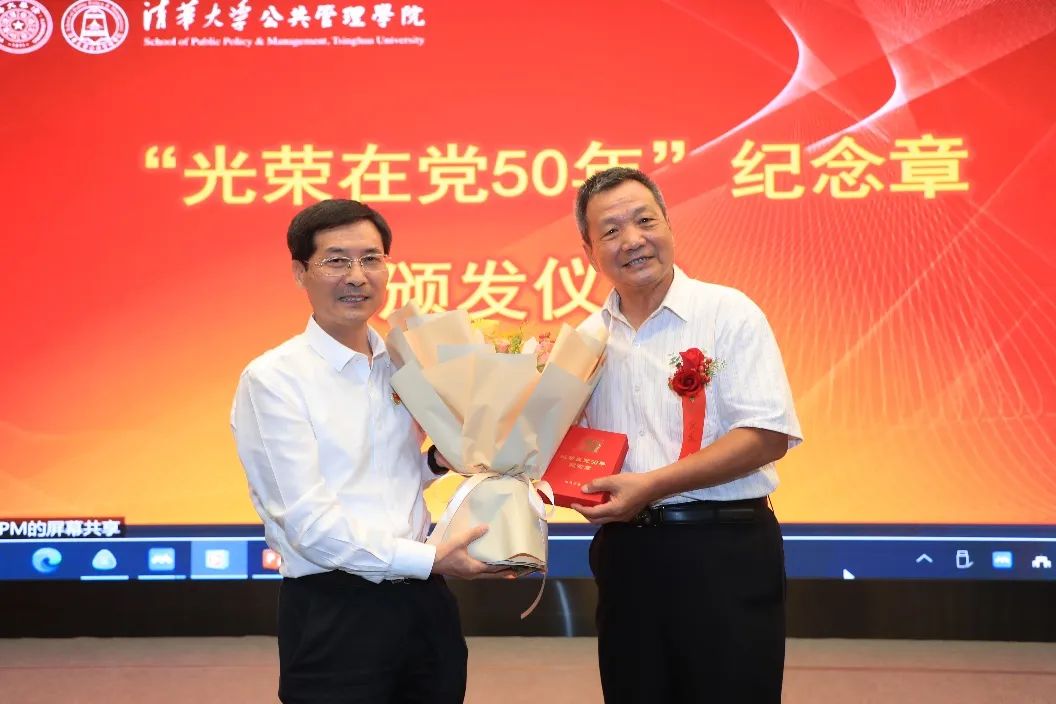会议特设年度颁奖环节。党委书记彭宗超为学院退休教师刘庆龙颁发了“光荣在党50年”纪念章,学院班子成员为获得“清华大学2021年度教学优秀奖”“清华大学公共管理学院2021年度教学优秀奖”以及获得“清华大学2021年度考核优秀”和“清华大学公共管理学院2021年度考核优秀”的教职工颁奖。
