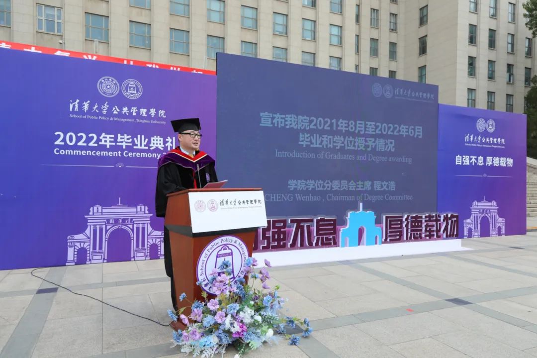 首先,程文浩宣布了公管学院2021年8月至2022年6月毕业和学位授予情况:从去年8月到今年6月,共有300余位同学顺利完成学业、获得学位。