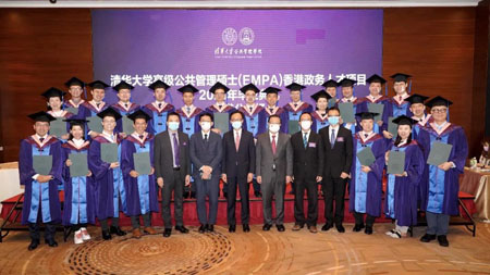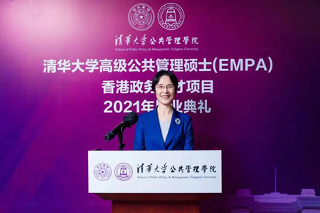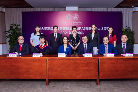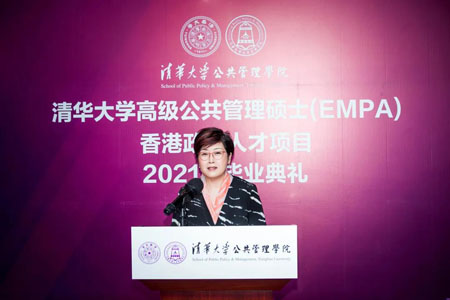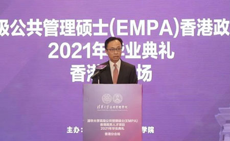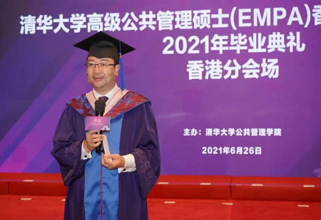 6月26日下午,清华大学高级公共管理硕士(EMPA)香港政务人才项目2021年首届毕业典礼以北京主会场和香港分会场现场连线的方式隆重举行。清华大学副校长杨斌教授,清华公管学院院长江小涓教授,香港特别行政区政府公务员事务局局长、太平绅士聂德权先生,全国人大常委会委员、香港再出发大联盟秘书长、项目顾问谭耀宗先生分别在北京及香港两地出席典礼并致辞。清华公管学院党委书记彭宗超教授主持了毕业典礼。