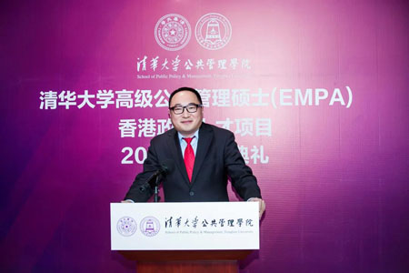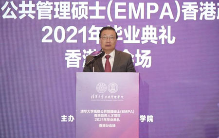 全国人大常委会委员、项目顾问谭耀宗在致辞中表示,该项目由全国最高学府清华大学和国内排名A+的公共管理学院主办,对弥补香港治理人才的缺口非常有益,在各方努力下,该项目已招收四届学生,希望项目越办越好。在过去两年多以来,香港社会经受了多重考验和挑战,在中央政府的帮助和支持下,香港社会逐渐稳定。谭耀宗常委期望同学们在未来的日子里,一定要坚决维护“一国两制”,要积极融入国家发展大局,维护国家安全和国家利益,不断奋斗,不断努力,不忘初心,不忘使命的担当,努力不辜负社会各界对同学们的期望。