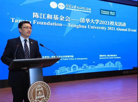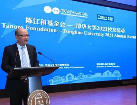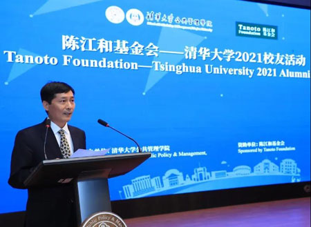 彭宗超代表公管学院致辞。致辞中,他向亚投行和陈江和基金会的嘉宾表示欢迎,并向陈江和基金会对校友活动的支持表示感谢。他与院友们分享了今年清华大学110周年校庆的喜讯,以及公管学院过去一年在教学和研究上的努力与创新。他认为,新冠肺炎疫情让我们认识到世界已经是一个密不可分的共同体,开放、合作与人才培养至关重要,清华公管将继续致力于公共管理和全球治理人才的培养。