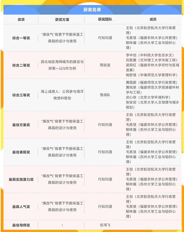 按照“中国绿色创新竞赛”的评分规则,每个团队的最终得分由前期的方案报告评分和综合现场评分”相加得出,二者各占一半。最终,来自北京航空航天大学的王倪、苏州大学的郁林瀚、福建农林大学的毛恩慧三位同学组成的“行知问道”团队成为最终的大赢家,包揽了综合一等奖、最佳方案奖、最佳表现奖、最具实践潜力奖、最具人气奖多个奖项。