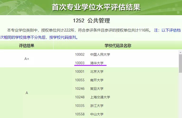 2018年7月26日,教育部学位与研究生教育发展中心公布了全国首次专业学位水平评估结果,清华大学公共管理专业学位教育获评A+。此次专业学位水平评估历时两年多,全国共有116所授权单位参评公共管理专业学位水平评估,共有2家单位获评A+(前2%),6家单位获评A(2%~7%),6家单位获评A-(7%~15%)。在此前教育部组织的第四轮学科评估中,清华大学公共管理学科获评A+学科,入选教育部“双一流”建设学科。此次,清华大学公共管理专业学位教育获评A+,表明清华大学公共管理学院学科发展与学位教育齐头并进,同时位居中国公共管理学科和教育的最前列,受到了学术界与社会各界的高度认可。