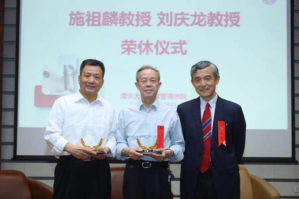 春风化雨,桃李芬芳。29日上午,清华公管施祖麟、刘庆龙二位教师的荣休仪式在学院报告厅举行。公管学院党委书记彭宗超主持仪式。仪式现场回顾了两位老师的从教生涯,两位老师培育的数百名学生名单引发了经久不息的掌声。薛澜院长代表学院致辞,向二位老师致以衷心的感谢和崇高的敬意,并为其颁发荣休纪念品。校离退休处副处长祝光英出席会议并发言,感谢公管学院开荣休仪式之先河,感谢历任领导对老同志的珍爱、尊重。学校老科协常务副会长刘贵对公管学院举办荣休仪式表示高度的赞赏,同时聘请施祖麟老师为老科协建言献策高级顾问,聘请刘庆龙老师为老科协常务副会长。公管学院戴亦欣副教授、郑兴祥院友作为施祖麟教授、刘庆龙教授早期培养的学生代表为二位教师献花。