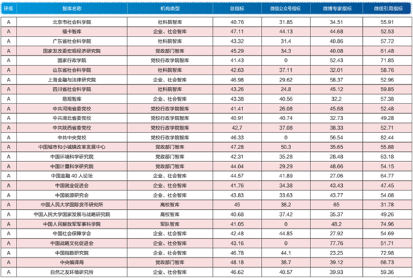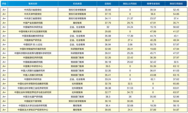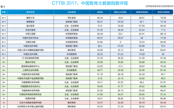 基于中国智库行为的三类数据集,我们构建了由中国智库微信公号影响力、智库微博专家影响力和智库微信引用影响力三个一级指标和若干二级指标所组成的“中国智库大数据指数”(Chinese Think Tank Big-Data Index,CTTBI)。最终,我们对中国智库微信公号影响力、中国智库微博专家影响力、中国智库微信引用影响力和中国智库大数据影响力等四个维度进行了评价与评级。相比于2016年,中国智库在新媒体平台上表现的更加活跃,智库的社会影响力也有了较大的提升。