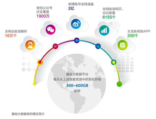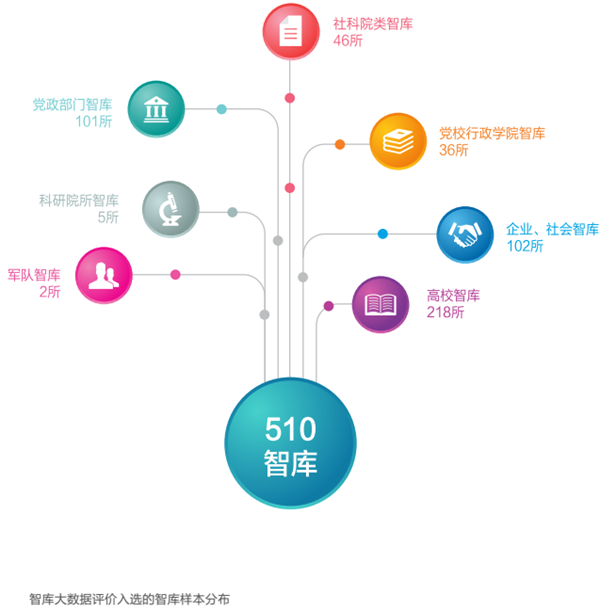 《中国智库大数据报告(2017)》以中国7类共510家智库为研究对象。数据来源于包括16万个网站、1900万个活跃微信公众号、2亿个活跃微博账户、6155个论坛和200个主流新闻类APP在内的基础数据库平台。我们以510家智库的全称和简称作为关键词在基础数据库平台上检索,对源数据进行清洗、匹配和分析,最终获得三类数据集:1)归属207家智库共259个智库微信公众号的所有发文信息;2)归属190家智库共1186位智库微博专家的账户信息和发文信息;3)510家智库在1900万个活跃微信公众号中被提及或引用的文章及其文章信息。