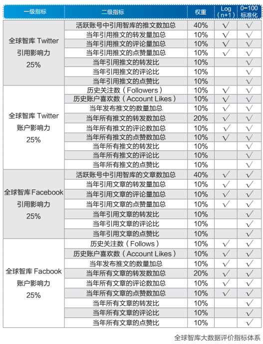 基于全球智库行为的两类数据集,我们构建了包括全球智库Twitter账户影响力、全球智库Twitter引用影响力、全球智库Facebook账户影响力和全球智库Facebook引用影响力的四个一级指标和若干个二级指标在内的“全球智库大数据指数”(Global Think Tank Big-Data Index,GTTBI)。最终,我们对全球智库Twitter账户影响力、全球智库Twitter引用影响力、全球智库Facebook账户影响力、全球智库Facebook引用影响力和全球智库大数据影响力等五个维度进行了评价与评级。