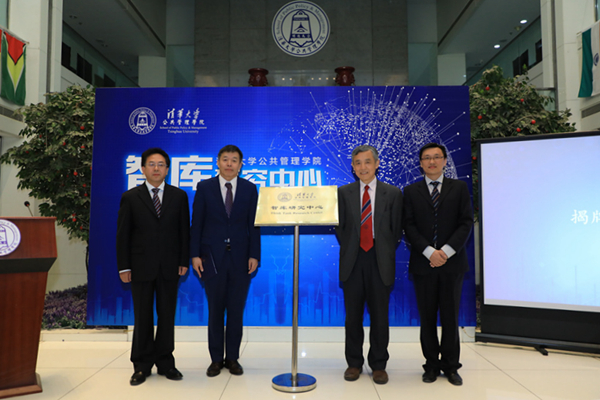 图为智库研究中心揭牌仪式(从左至右:胡鞍钢、薛澜、苏竣、朱旭峰)。