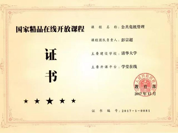 1月15日,教育部召开新闻发布会,介绍首批“国家精品在线开放课程”有关情况,并首次正式推出了490门“国家精品在线开放课程”,清华公管彭宗超教授领衔开设的《公共危机管理》课程位列其中。1月17日,在清华大学2017-2018学年全校教学工作总结会上,清华大学副校长杨斌宣读了清华大学首批“国家精品在线开放课程”入选名单,会议为入选课程颁发了奖状。