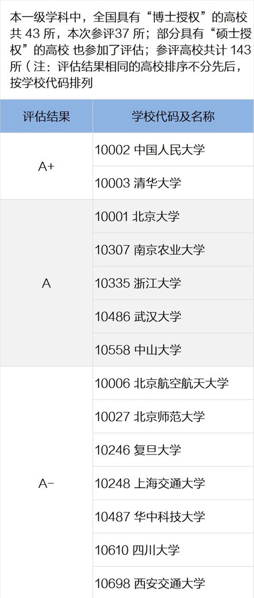 在本轮学科评估中,清华大学、北京大学以21个A+级一级学科领跑全国高校,浙江大学、中国人民大学、中国科学技术大学分别以11个、9个、7个A+一级学科列3-5名。