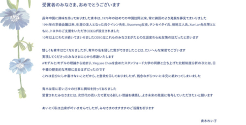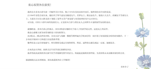 青木昌彦夫人青木令子特发来祝贺函,她对获奖的青年学者表示衷心的祝贺。青木令子表示,青木昌彦生前始终关注年轻学者们的研究事业,希望获得该奖项的新生代学者们能够凭借年轻的活力,构建起更新的经济理论,为美好的未来贡献出你们的力量。星岳雄在现场代为宣读了青木令子的贺函。