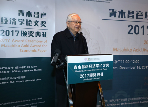 2017年12月16日上午,首届“青木昌彦经济学论文奖”颁奖典礼在清华启迪会议中心举行。国务院发展研究中心研究员、CIDEG学术委员会主席、“青木昌彦经济学论文奖”评审委员会主席吴敬琏,国务院发展研究中心原党组书记、副主任、研究员、清华大学公共管理学院首任院长、CIDEG理事长陈清泰,美国加州大学圣地亚哥分校国际关系与太平洋研究生院教授、CIDEG学术委员巴瑞·诺顿,斯坦福大学商学院教授、CIDEG学术委员星岳雄,亚洲成长研究所所长、CIDEG学术委员八田达夫,中欧商学院经济学教授车嘉华,《比较》杂志副主编肖梦,博源基金会理事长秦晓,原中信证券股份有限公司董事长德地立人等出席颁奖典礼。颁奖典礼由清华大学公共管理学院院长、CIDEG主任薛澜主持。CIDEG学者、理事和入围论文作者、投稿人见证了颁奖典礼。