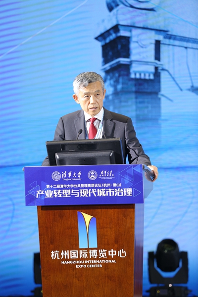 论坛主旨演讲环节由清华大学公共管理学院院长薛澜主持。国务院参事、中国城市科学研究会理事长、住建部原副部长仇保兴,清华大学公共管理学院教授、国情研究院院长胡鞍钢,阿里巴巴集团技术委员会主席王坚,浙江省政府咨询委学术委员会副主任、省发展和改革委员会原副主任刘亭,清华大学公共管理学院教授巫永平作主题发言。