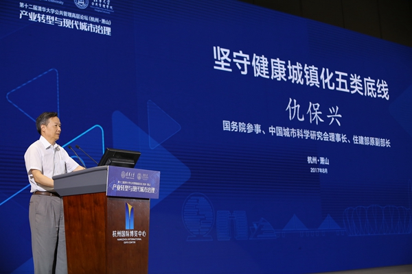 仇保兴作题为《坚守健康城镇化五类底线》主旨演讲。他表示,健康城镇化应该坚守大中小城市和小城镇协调发展、城市与农村互补协调发展、城镇空间保持紧凑、防止出现空城、保护好文化遗产和自然遗产这五类底线。健康和谐的城镇化是市场无形的手和政府有形的手共同作用的结果,以人为本的城镇化决策是长久之计。