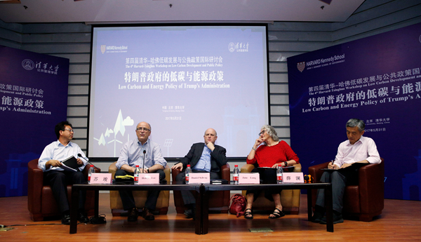 会议聚焦2030年后,中美碳排放达峰之后低碳发展的技术路线和公共政策制度安排等热点问题。在大会前一天举行的《特朗普政府的低碳与能源政策》学术沙龙中,清华大学苏竣、薛澜教授与哈佛大学Daniel Schrag、Henry Lee教授,加州理工学院简·朗(Jane Long)教授就特朗普时期的美国低碳与能源政策,包括特朗普政府对于全球气候变化治理预算的全面削减,以及宣布退出“巴黎协定”等举措,对于未来美国能源政策走向以及可能产生的能源局势变化展开了深入讨论。