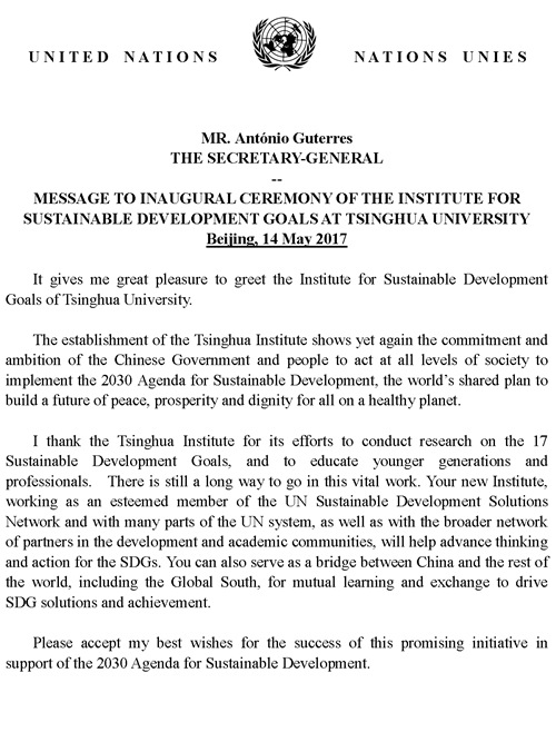联合国秘书长古特雷斯(Antonio Guterres)先生亲致贺信:他首先对清华大学全球可持续发展研究院的成立表示祝贺,并指出,清华全球可持续研究院的成立再次彰显了中国政府和人民在社会各个层面采取行动贯彻“2030年可持续发展议程”的承诺和抱负。教育和培养致力于17个可持续目标的研究年轻一代和专业性人才将成为可持续发展研究院最重要的使命,任重而道远。清华可持续发展研究院作为联合国可持续发展行动网络中的成员,与联合国机构、国际组织和学术界建立了广泛的合作伙伴关系,期待可持续发展研究院发挥连接中国与世界其他地区的桥梁作用,促进中国与世界在SDGs领域的经验交流与互鉴,共同推进实现联合国可持续发展17项目标。