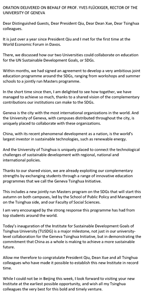 作为清华大学SDGs全面战略合作伙伴,日内瓦大学校长伊夫·弗吕克格尔(Yves Flückiger)致信清华大学校长邱勇院士,他在信中回顾了一年多来两校在开展联合国可持续发展目标方面的合作历程,并对即将在今年秋季启动的清华公共管理学院与日内瓦大学社会科学学院合作的PP-SDG双硕士学位项目表示祝贺。他向邱勇校长、薛澜院长和清华同仁表示祝贺,并表示清华大学全球可持续发展研究院的落成是一个重要的里程碑,不仅对两校合作战略来说至关重要,更向国际社会展示了中国致力于实现更可持续发展的未来。