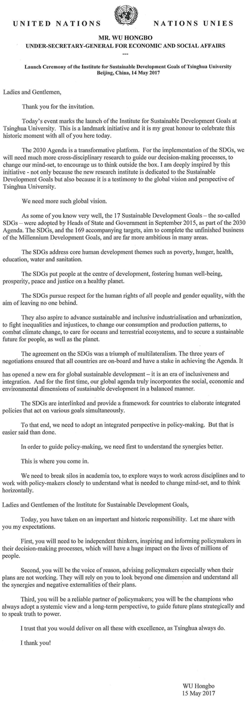 联合国主管经济和社会事务的副秘书长、联合国全球可持续发展议程主要推动者之一的吴红波先生也发来贺信:他高度赞扬清华大学全球可持续发展研究院的成立具有划时代意义,并对研究院在未来承担的推动全球发展的使命寄予厚望。他表示,清华成立全球可持续发展研究院积极响应联合国倡议,是清华大学全球愿景与战略的具体体现。他提出,要推动可持续发展目标的实现,我们需要成为独立的思想者,需要发出我们的声音,激励政策制定者,这些政策将对数百万人的生活产生巨大的影响。其次,努力成为决策者可靠的合作伙伴,帮助决策者跳出既定思维,为决策者提供建议,用于指导未来的战略计划并付诸实施。