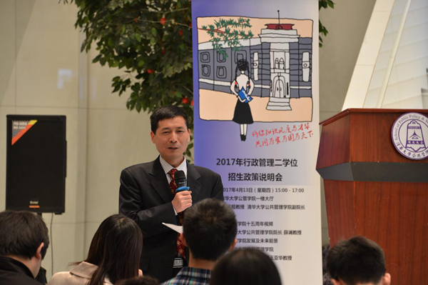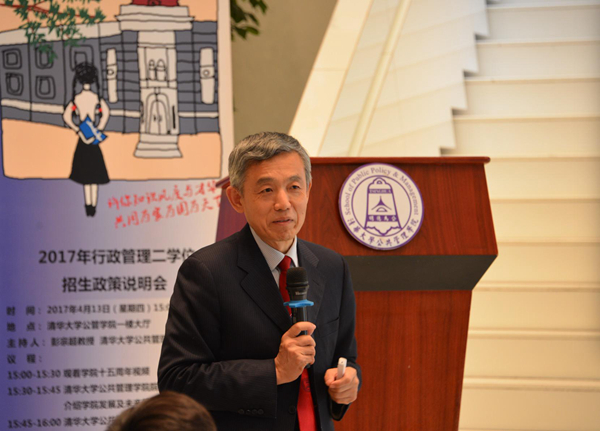 4月13日下午,清华大学公共管理学院首届行政管理本科第二学位招生说明会在学院大厅举行。说明会由清华公管学院副院长彭宗超主持,院长薛澜,党委书记过勇,副书记谢矜,第二学位项目主任王亚华,学院教师于永达、刘志林、张严冰等出席。说明会吸引了全校各院系数十名同学参加。