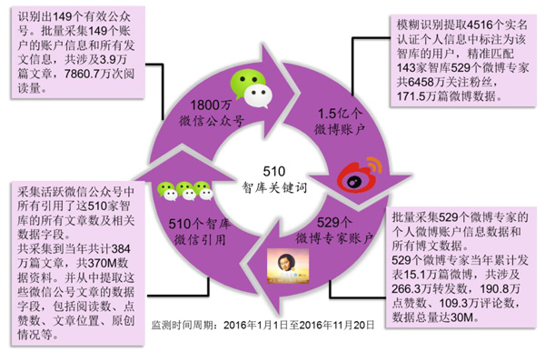 我们以510家智库的全称与智库各种类型的简称作为搜索关键词,在微信、新浪微博中进行初步数据抓取和批量采集,构建基础数据库,再进行数据清洗与精 准匹 配。最后,我们获取了智库的微信公众号、智库微博专家以及智库在全部活跃微信公众号上的活动痕迹数据。采集的数据时间周期为:2016年1月1日至 2016年11月20日。