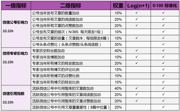 微信引用影响力(所有微 信公号推送文章中提到了某家智库情况以及这些文章的影响力)的二级指标为:活跃微信公众号中引用智库的文章数加总、活跃微信公号中 引用智库的文章阅读数加总、活跃微信公号中引用智库的文章点赞数加总、活跃微信公号中引用文章位置重要性等四个指标。