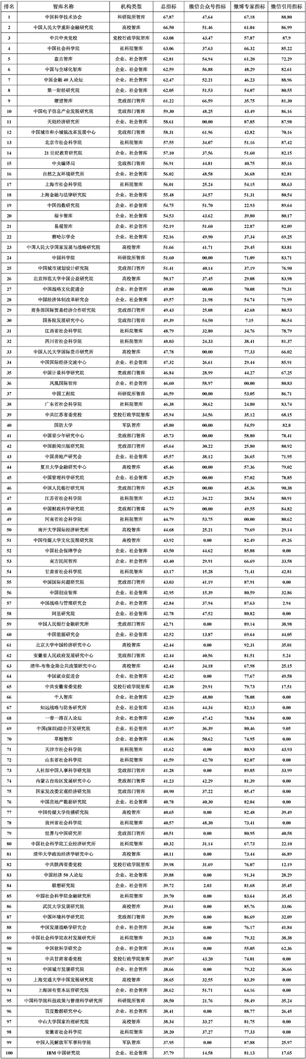 智库微信引用影响力排名情况中排名前十名的分别是(具体见表3):北京大学中国经济研究中心、中国经济50人论坛、中国人民银行研究局、人社部中国人 事科 学研究院、中国指数研究院、北京大学国家发展研究院、中国人民银行金融研究所、中国金融40人论坛、中国科学技术协会、百度数据研究中心。可以看出,经 济、金融、财经类智库的观点往往受到各类活跃微信公众号的广泛引用。