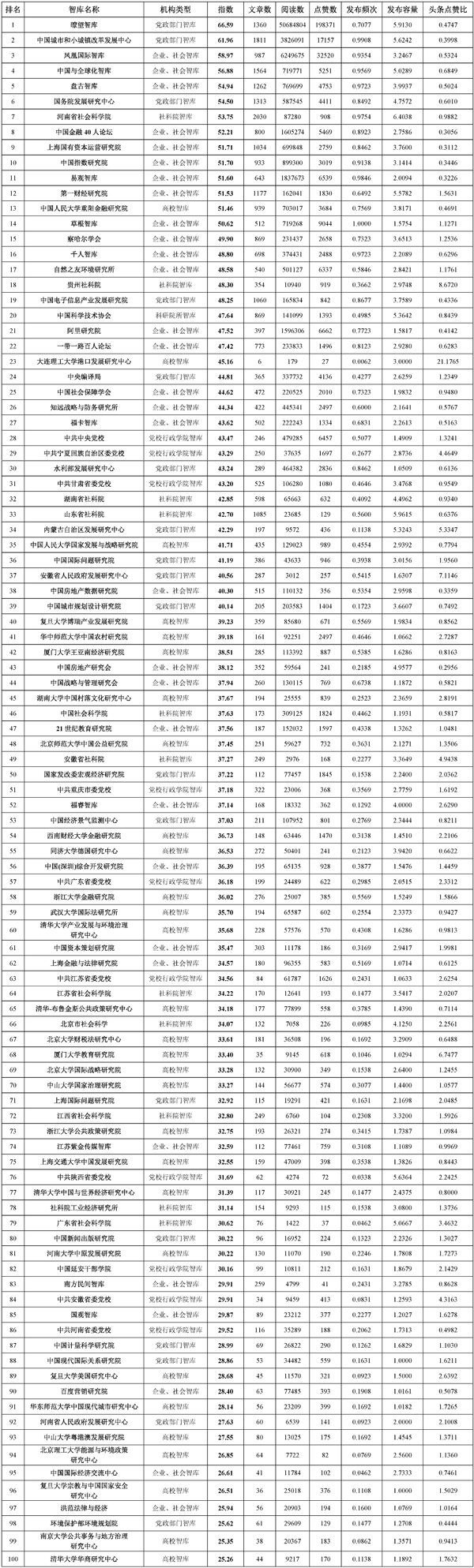 注释:“文章数”是指该智库微信公众号当年发文数加总;“阅读数”指 该智库微信公众号当年所有文章的阅读数加总;“点赞数”指该智库微信公众号当年所有文章的点赞数加总; “发布频次”是指该智库微信公众号当年发布文章的频次(微信规则是,公众号每天限发一组文章;发布次数/365 天);“发布容量”是指该智库微信公众号当年平均每组发文的数量(每组文章限发8篇;文章数量/发布次数); “头条点赞比”是指该智库微信公众号当年每组中头条文章的平均点赞比率(头条文章点赞数加总/头条文章数)。
