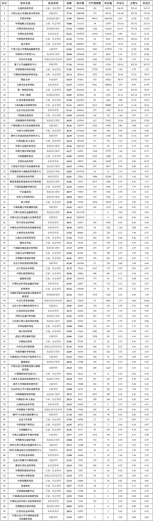 注释:“粉丝数”是指认证该智库的所有专家的当前粉丝数加总;“当年微博数& amp; amp; amp; amp; rdquo;是指认证该智库的所有专家当年发微博数量的加总;“转发数”是指认证该智库的所有专家当年所有博文 被转发的数量加总;“评论比”是指认证该智库的所有专家当年所有博文的评论比率(博文评论数加总/博文总数); “点赞比”是指认证该智库的所有专家当年所有博文的点赞比率(博文点赞数加总/博文总数);& ldquo;转发比”是指认证该智库的所有专家当年所有博文的转发比率(博文转发数加总/博文总数)。?
