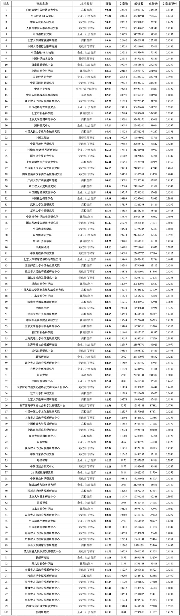 注释:“文章数”是指在所有活跃微信公众号文章中引用了该智库的文章数量加总;阅读数是指所有活跃微信公众号文 章中引用了该智库的文章的阅读数量加总;点赞数是所有活跃微信公众号文章中引用了该智库的文章的点赞数量加总;文章重要性是指所有活跃微信公众号文章中引 用了该智库的文章的位置重要性(文章数量/文章所处位置数加总)。
