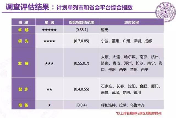 计划单列市和省会城市服务平台中,宁波、福州、广州、深圳、成都,共5个互联网+政务服务平台处于“领先”阶段(四星级);