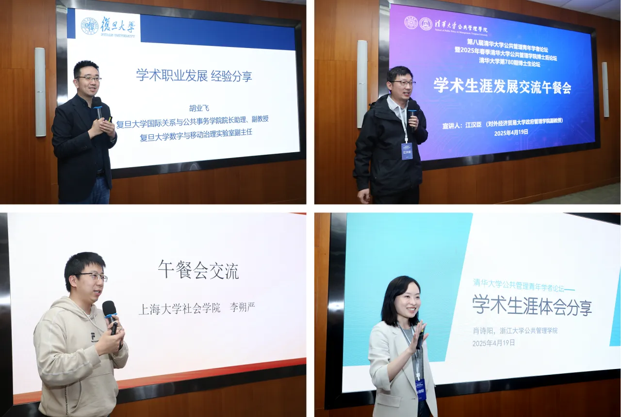 本届论坛设置了学术生涯发展交流午餐会环节。会议邀请了复旦大学国际关系与公共事务学院胡业飞副教授、对外经济贸易大学政府管理学院江汉臣副教授、上海大学社会学院李朔严副教授、浙江大学公共管理学院百人计划研究员、博士生导师肖诗阳分享学术生涯发展心得。交流会由清华大学公共管理学院周绍杰教授主持。