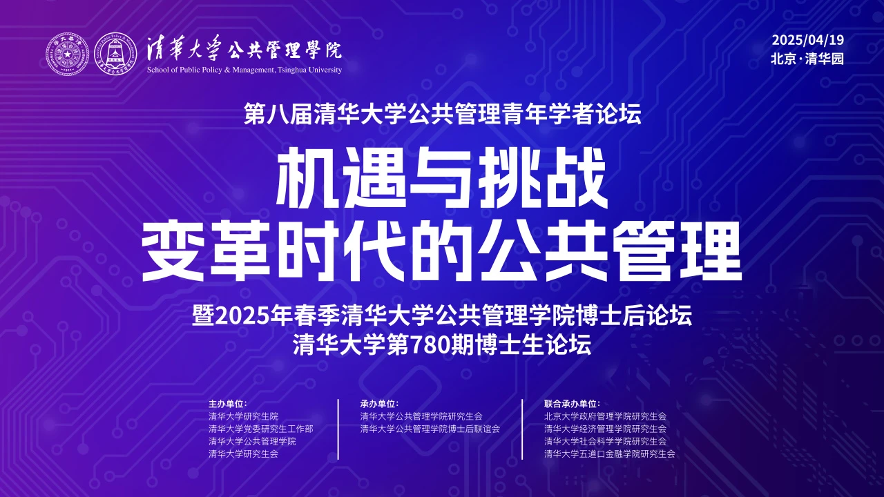 2025年4月19日,在清华大学即将迎来建校114周年之际,第八届清华大学公共管理青年学者论坛暨2025年春季清华大学公共管理学院博士后论坛、清华大学第780期博士生论坛在公管学院成功举办。本届论坛以“机遇与挑战:变革时代的公共管理”为主题,由清华大学研究生院、清华大学党委研究生工作部、清华大学公共管理学院、清华大学研究生会联合主办。来自全国部分高校的特邀嘉宾、国内外期刊主编、青年学者以及公共管理学院院友出席论坛。学院党委书记彭宗超、党委副书记唐啸等与部分师生也参加了论坛交流。
