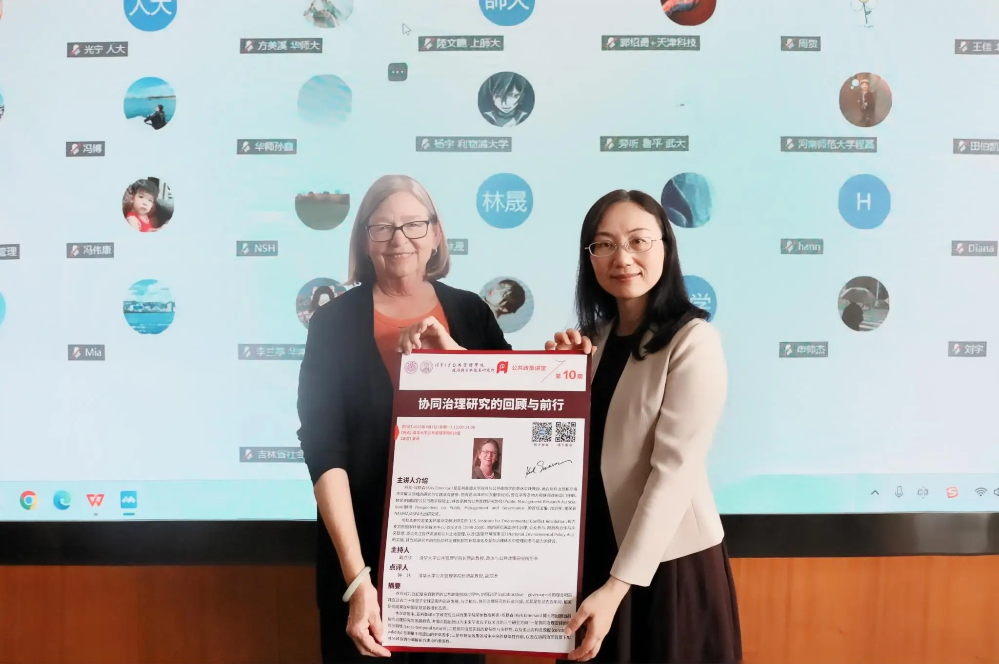 2025年4月7日下午,清华大学公共管理学院政治与公共政策研究所公共政策讲堂第10期活动在公管学院620会议室举行。美国国家公共行政学院院士、亚利桑那大学政府与公共政策学院荣休实践教授、Perspectives on Public Management and Governance创刊主编柯克·埃默森(Kirk Emerson)以“协同治理研究的回顾与前行”为题进行了讲座,共有一百三十多人通过线上线下的方式参加了此次活动。参加本次活动的学院教师包括王有强、朱旭峰、王亚华、刘志林、钟玮、陈济冬、赵静。政策所所长戴亦欣主持活动。