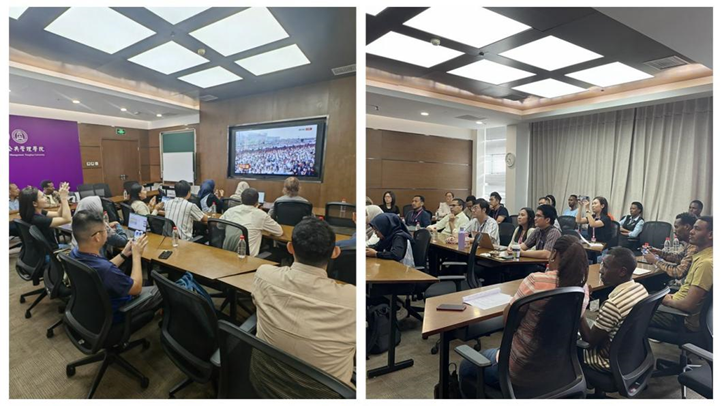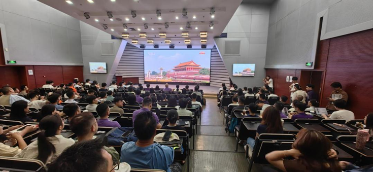 学院党委书记彭宗超、院长朱旭峰等班子成员及师生员工近200人在报告厅及分会场620会议室集体观看大会直播,近40名留学生在510会议室观看英文直播,40名学生在学校集体观看大会实况。