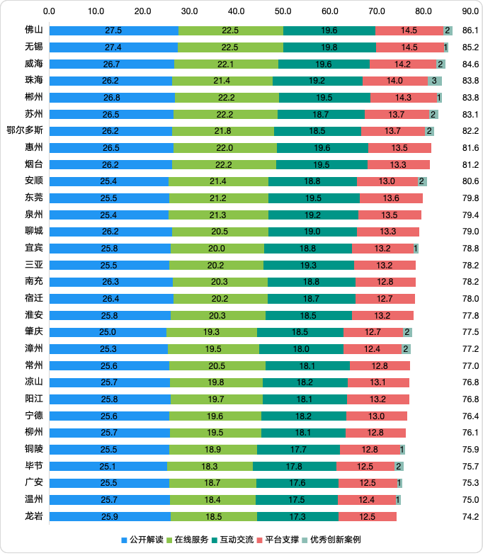 地级市政府中:佛山、无锡、威海、珠海/郴州、苏州、鄂尔多斯、惠州、烟台、安顺、东莞、泉州、聊城、宜宾、三亚/南充、宿迁、淮安、肇庆、漳州、常州、凉山、阳江、宁德、柳州、铜陵、毕节、广安、温州和龙岩。