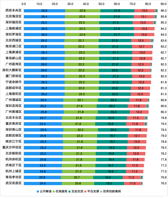 区县政府中(本次的调查范围为直辖市和副省级城市所辖区县):西安未央区、北京海淀区、深圳福田区、上海杨浦区、深圳罗湖区、北京西城区、南京浦口区、上海黄浦区/青岛崂山区、广州荔湾区、深圳大鹏新区、厦门思明区、宁波余姚市、成都成华区、上海普陀区、广州增城区、深圳龙岗区、广州黄埔区、北京丰台区、重庆南岸区/深圳南山区、成都武侯区、南京江宁区、重庆沙坪坝区、北京朝阳区、杭州余杭区、济南历下区、杭州上城区、青岛李沧区、武汉武昌区。