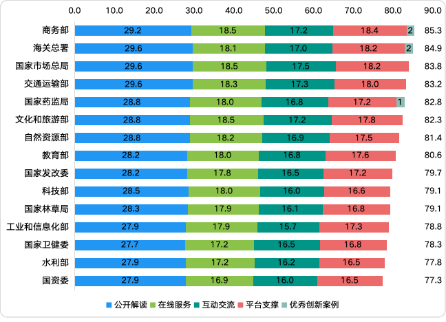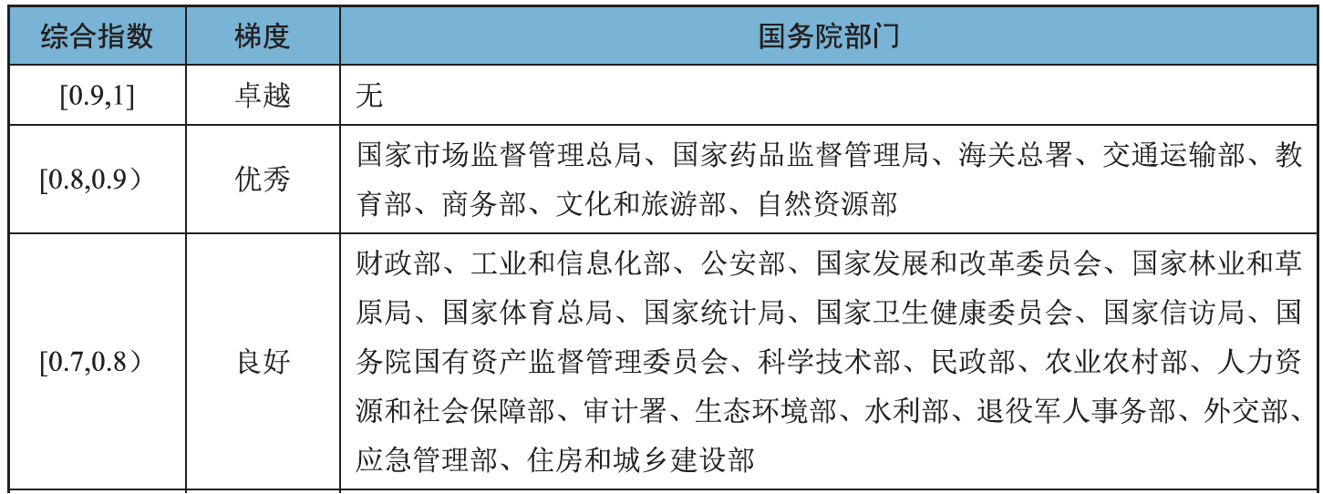 国务院部门中,8家位于“优秀”梯度,21家位于“良好”梯度。
