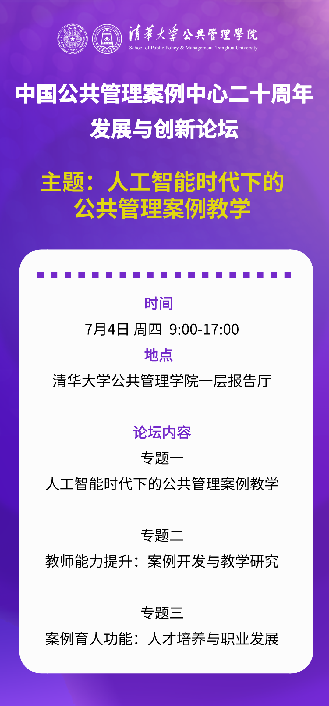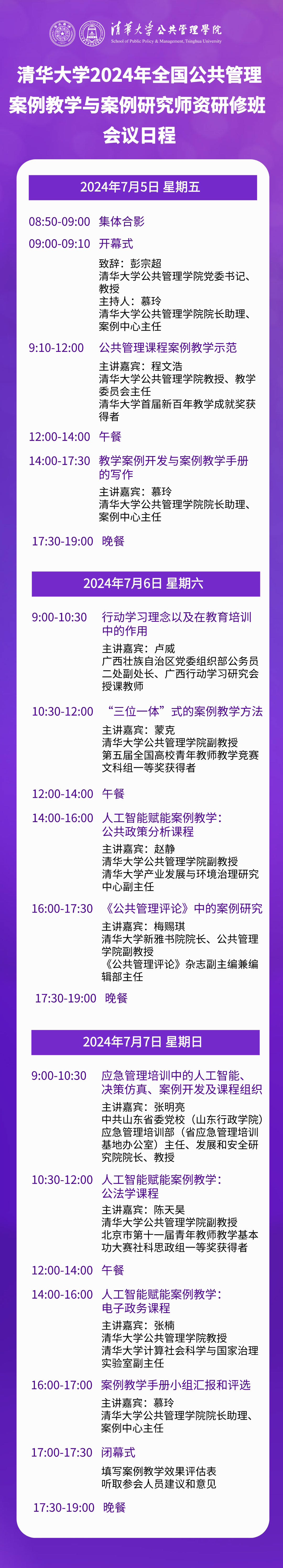 您好!为全面贯彻落实习近平总书记对研究生教育和干部教育培训的重要指示精神,切实执行中共中央宣传部、教育部联合印发的《面向2035高校哲学社会科学高质量发展行动计划》、教育部印发的《关于深入推进学术学位与专业学位研究生教育分类发展的意见》和中共中央印发的《全国干部教育培训规划(2023-2027年)》,充分挖掘新时代改革开放和社会主义现代化建设的丰富实践案例,加快推动中国特色案例建设,不断促进理论与实践融通、研究与教学融通、自主与合作融通,大力推动案例开发、案例教学、案例研究经验交流,系统提升教师案例教学与案例研究能力,在中国专业学位案例中心指导下,清华大学公共管理学院拟于2024年7月5-7日在北京举办全国公共管理案例教学与案例研究师资研修班。与此同时,在中国公共管理案例中心成立二十周年之际,7月4日学院将举办“人工智能时代下的公共管理案例教学”主题论坛,邀请公共管理领域多位专家学者、人工智能企业代表,深入探讨人工智能赋能案例教学、案例开发与教学研究、人才培养与职业发展等一系列前沿问题。