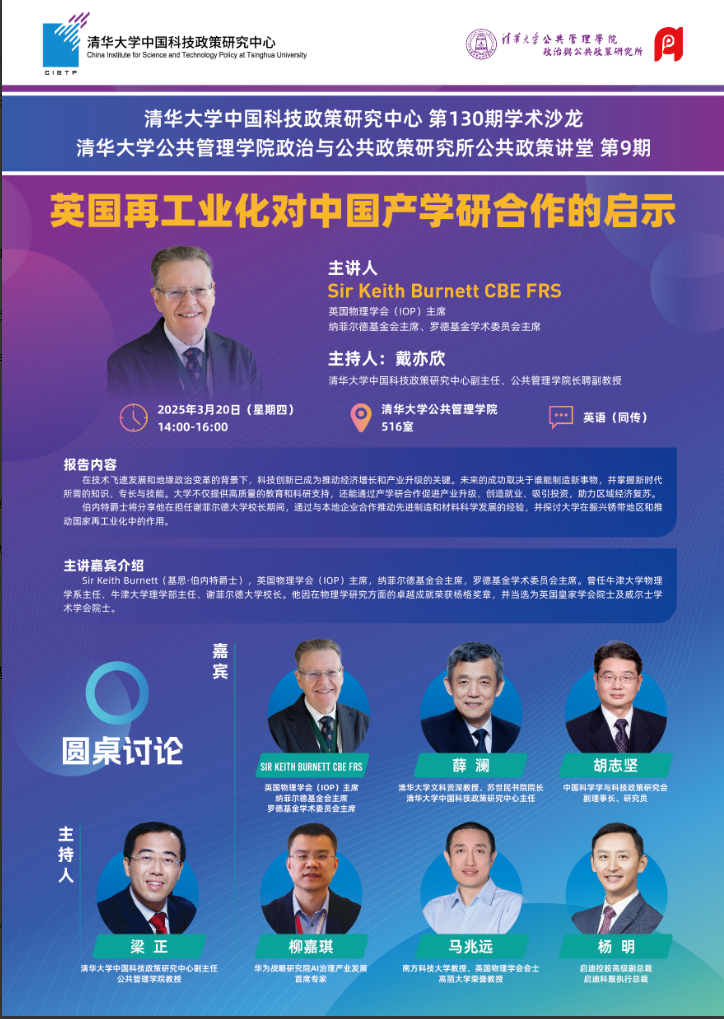 清华大学中国科技政策研究中心第130期学术沙龙:英国再工业化对中国产学研合作的启示(2025年3月20日 星期四 14:00-16:00)