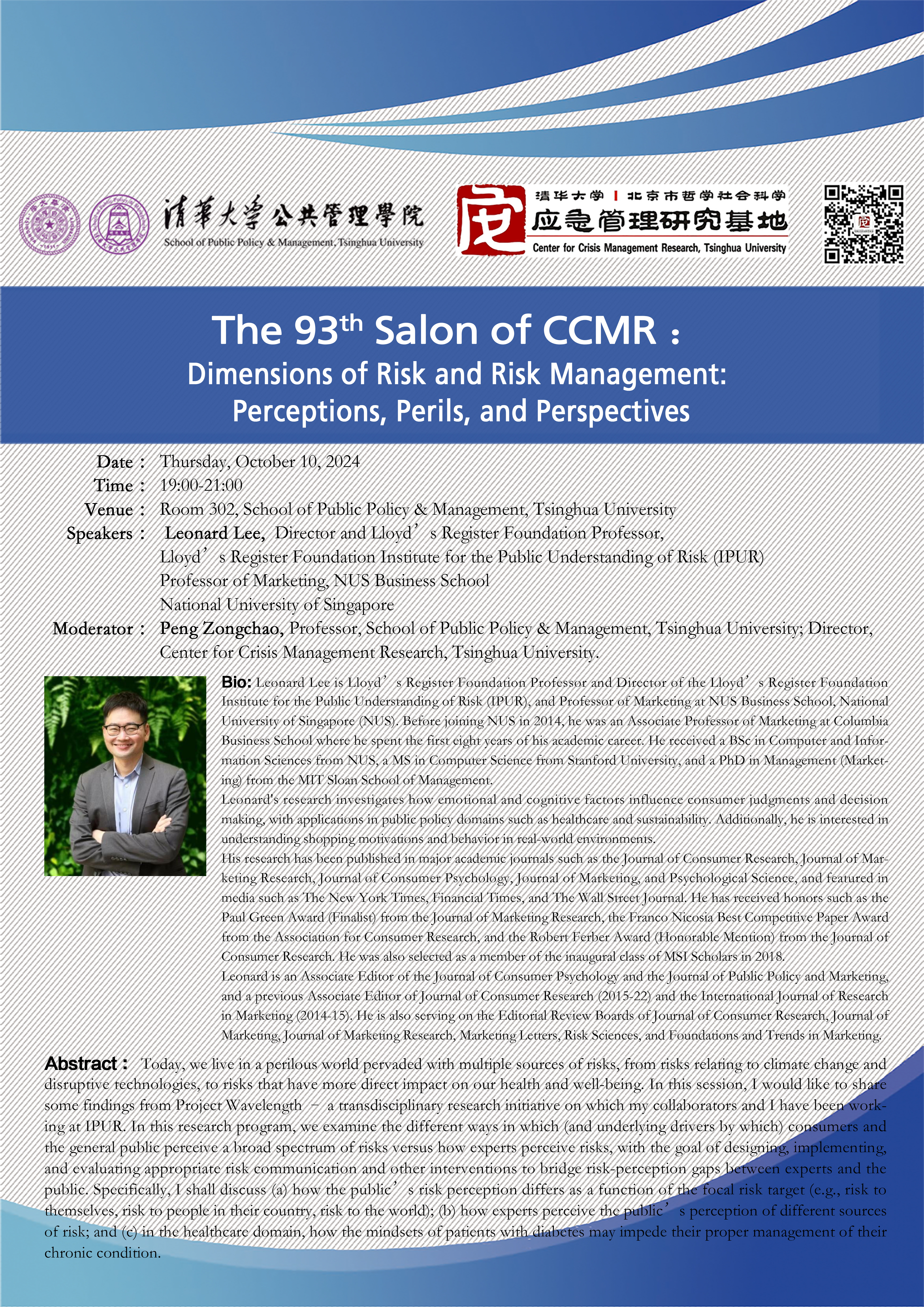 当今,我们生活在一个危机四伏的世界中,各种风险源层出不穷,从与气候变化和颠覆性技术相关的风险,到对我们健康和福祉有直接影响的风险。在本次会议中,将分享来自“波长项目”(Wavelength Project)的研究成果——这是Lee教授和其合作者在劳埃德注册基金会公众理解风险研究所(IPUR)开展的一项跨学科研究计划。在该研究计划中,研究了消费者和普通公众如何以不同的方式(以及背后的驱动因素)感知广泛的风险,并与专家对风险的感知进行对比,旨在设计、实施和评估适当的风险沟通和其他干预措施,以弥合专家和公众在风险感知方面的差距。具体而言,讲座将讨论(a)公众的风险感知如何因关注的风险目标(例如,对自己的风险、对所在国家人民的风险、对世界的风险)的不同而有所差异;(b)专家如何看待公众对不同风险源的感知;(c)在医疗保健领域,糖尿病患者的心态如何阻碍他们正确管理自己的慢性疾病。