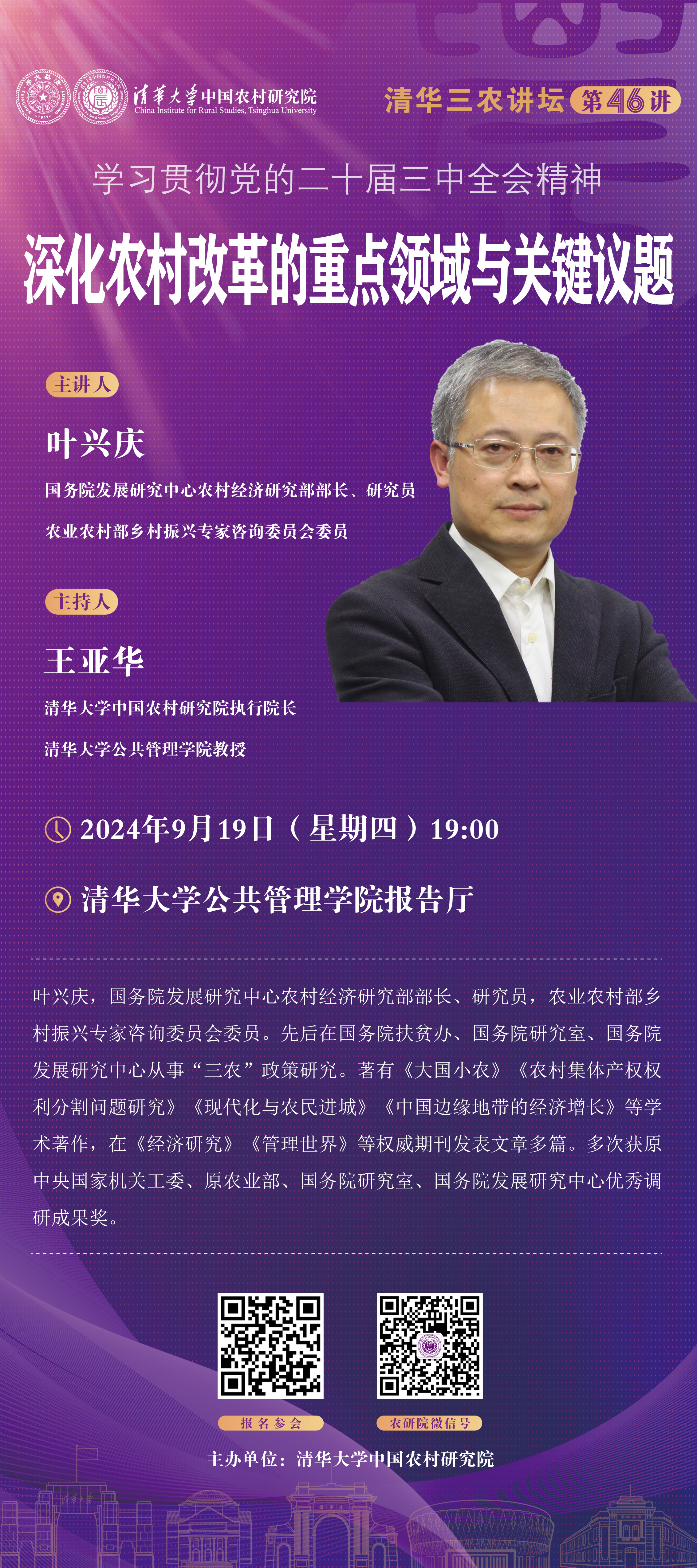 清华三农讲坛第46讲:深化农村改革的重点领域与关键议题(2024年9月19日 星期四 19:00)