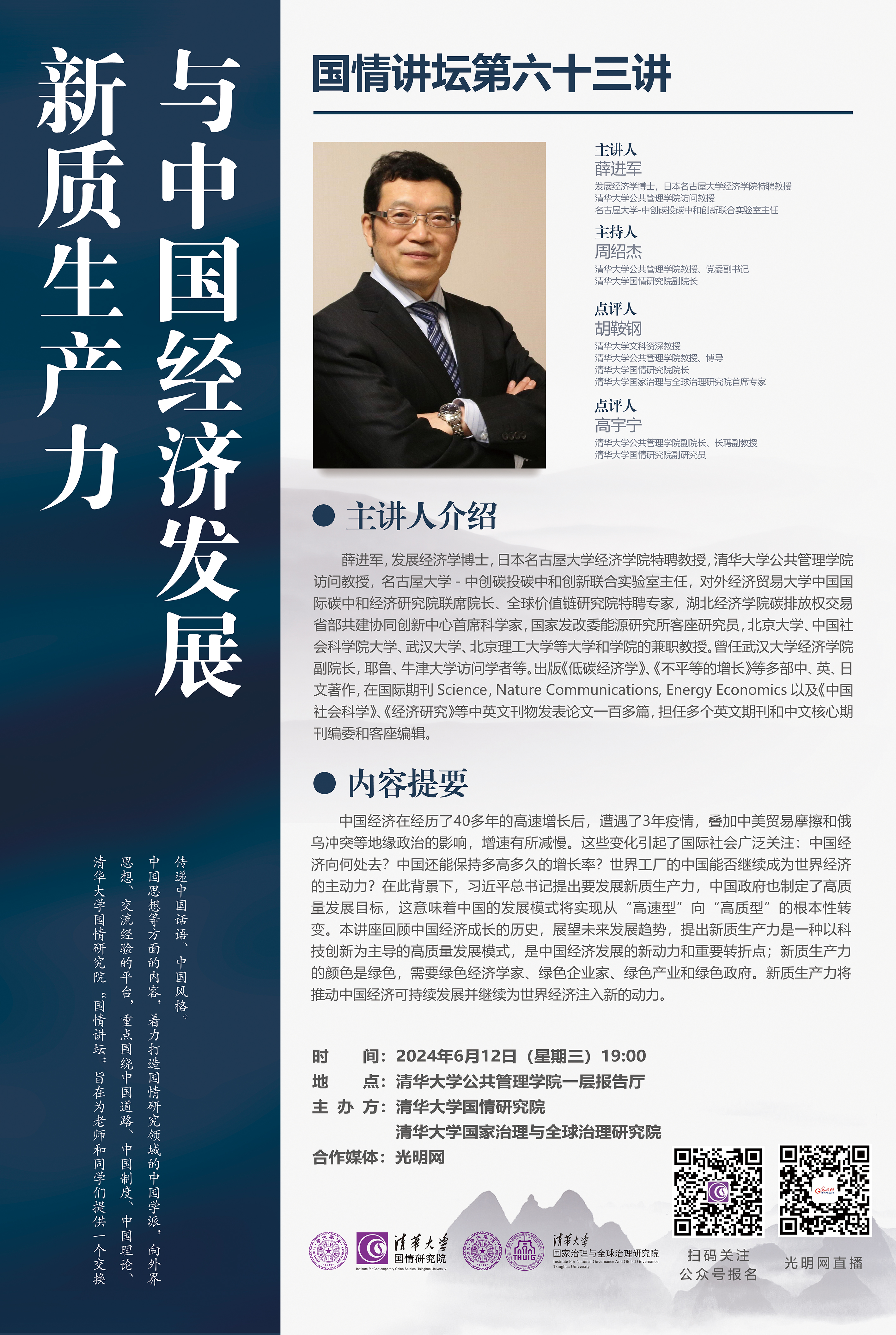 主讲人:薛进军 发展经济学博士,日本名古屋大学经济学院特聘教授,清华大学公共管理学院访问教授,名古屋大学-中创碳投碳中和创新联合实验室主任
