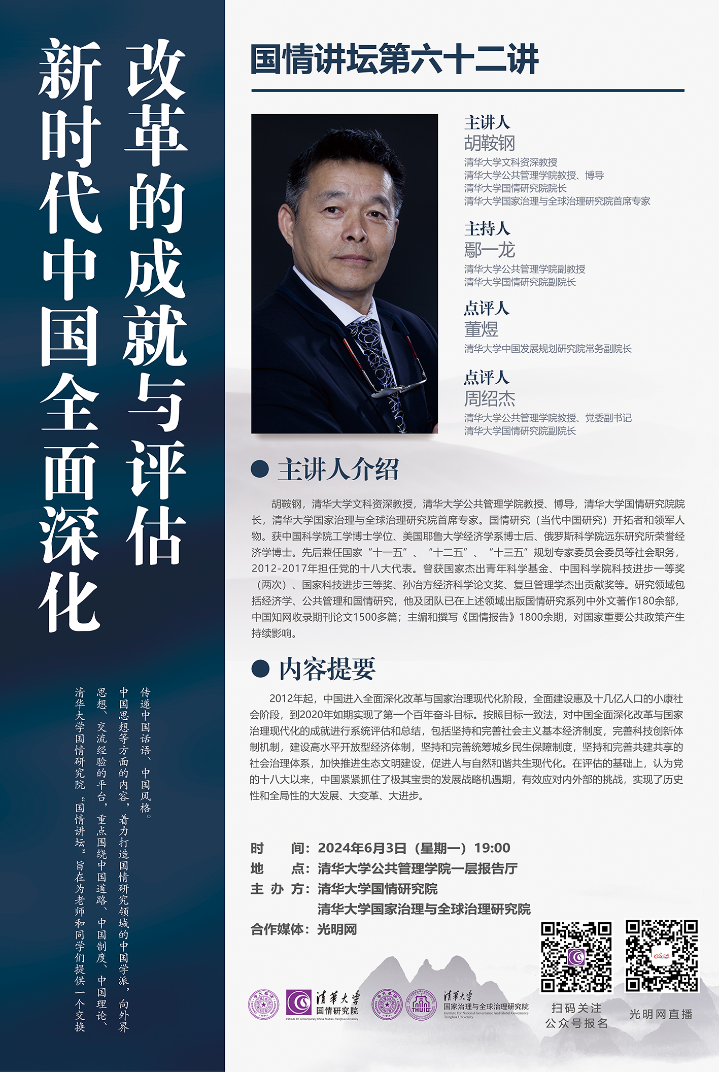 主讲人:胡鞍钢,清华大学文科资深教授,清华大学公共管理学院教授、博导,清华大学国情研究院院长,清华大学国家治理与全球治理研究院首席专家
