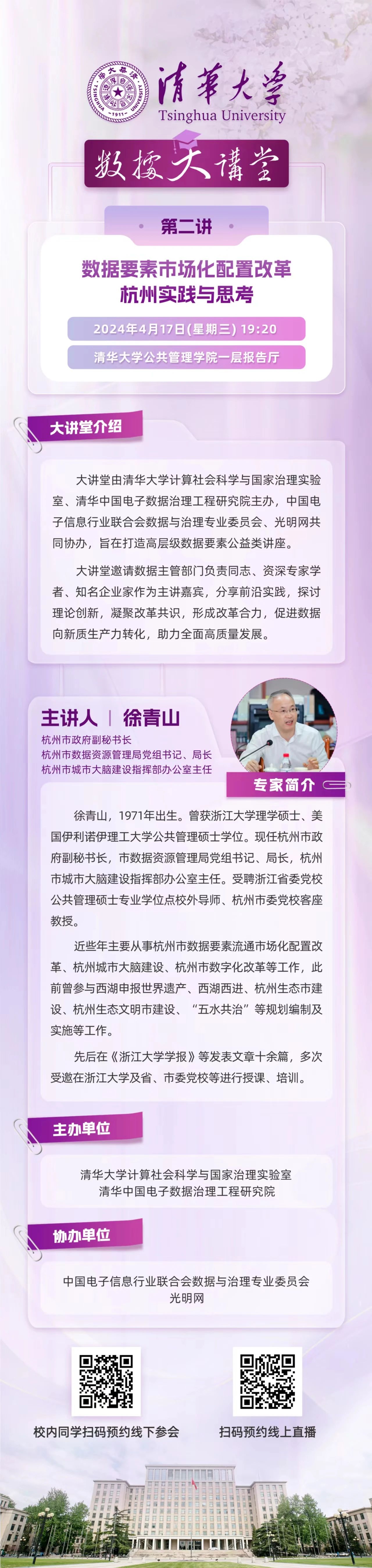 清华大学数据大讲堂(第二讲):数据要素市场化配置改革杭州实践与思考(2024年4月17日 星期三 19:20)